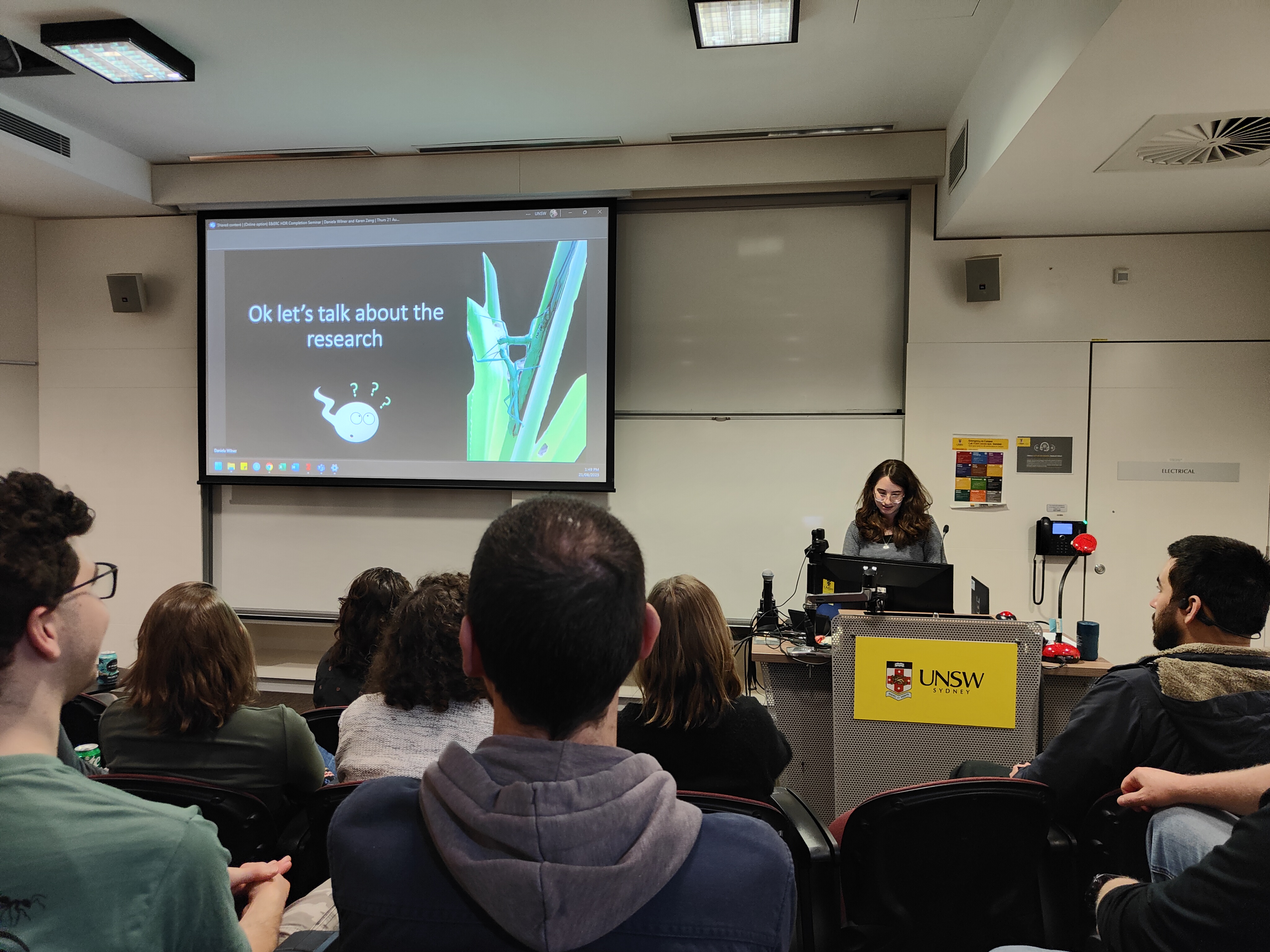 3/07/2024: Soleille Miller gave a talk at the Genetics Society of Australasia conference at Macquarie University. 26/02/2024: Congratulations to Ana Vasconcelos on completing her PhD! 15/12/2023: Congratulations to Caitlin Creak and Daniela Wilner on winning awards for their talks at the Australasian Evolution Society meeting at the University of Adelaide.
